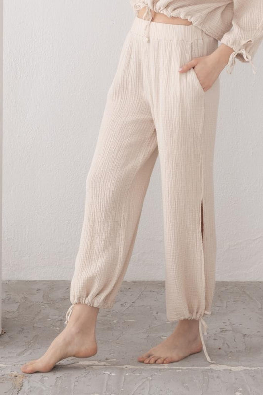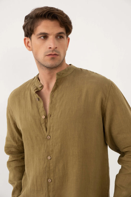 MEN PURE LINEN BANDED COLLAR SHIRT KHAKI
