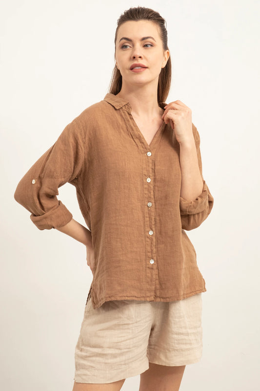MEN PURE LINEN BANDED COLLAR SHIRT BRICK